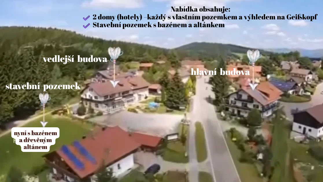 ✔️ Dvě budovy (hotely) – s celkovou kapacitou 40 ubytovacích jednotek (dvoulůžkové a třílůžkové pokoje, apartmány, byty atd.) – každá s vlastním pozemkem a výhledem na horu Geißkopf.